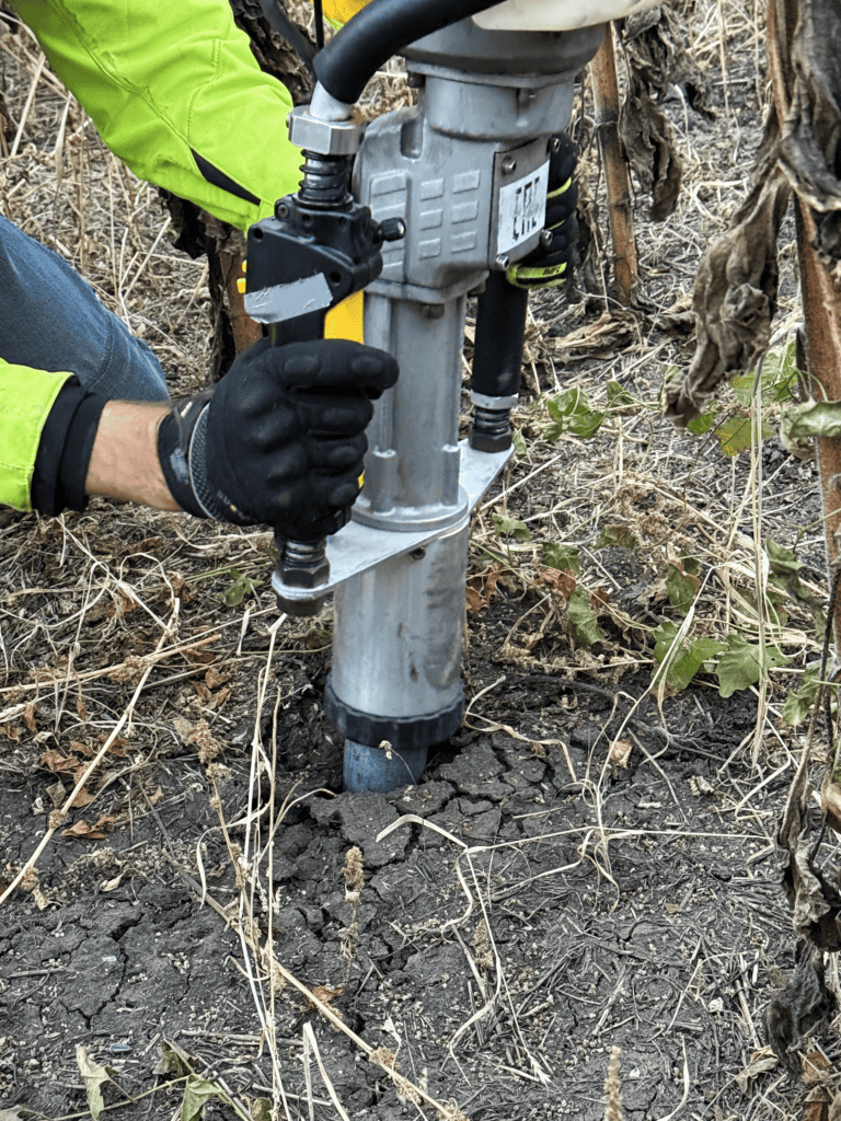 At each site, rTek’s custom-designed sampling corer drives a 50 mm wide-diameter core down to 45 cm or bedrock, using a vibratory hammer. Each soil core is extracted fully intact—even in planted fields. Compared to small nutrient probes, 50mm cores are much harder to drill, but the additional accuracy is worth the effort.